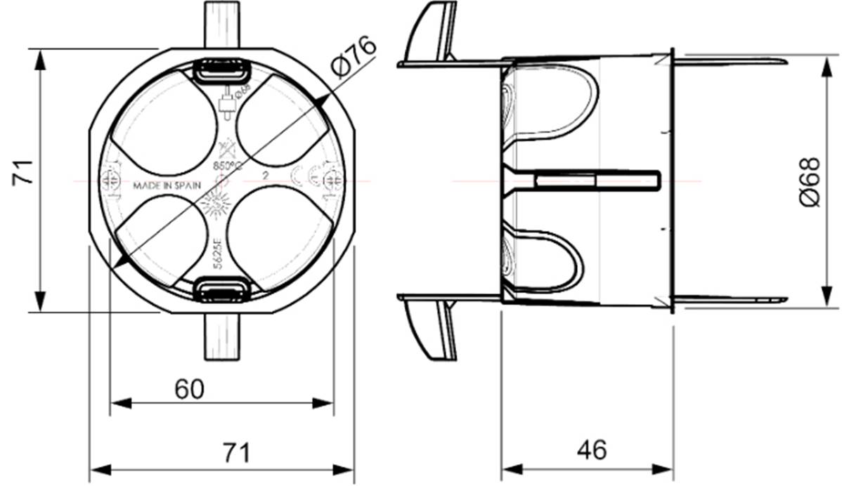 Cette boîte d'encastrement est conçue pour l’installation d’un module dans des cloisons sèches. Avec un diamètre d'encastrement de 68 mm et une profondeur de 46 mm, elle est compatible avec une couronne standard Ø 68 mm. Elle dispose de 4 entrées pour tubes : deux de Ø 20-25 mm et deux de Ø 16 mm, permettant un câblage flexible. Le système de fixation par bride en nylon assure une mise en œuvre fiable dans les environnements intérieurs domestiques ou tertiaires. Fabriquée en matériau isolant, elle est résistante aux températures élevées (jusqu’à 850 ºC) et sans halogène. Conforme aux principales normes européennes (UNE-EN 60670) et internationales, elle est idéale pour une intégration sécurisée dans les logements, bureaux ou commerces.