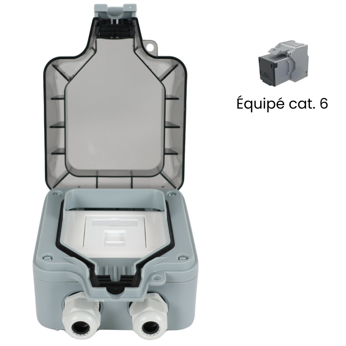 Le couvercle semi-transparent avec loquet de verrouillage assure une fermeture sûre et facile du boîtier, tandis que les entrées de câbles possibles sur toutes les faces permettent une installation flexible. Le boîtier est livré avec un plastron 1 port keystone et 1 embase RJ45 CAT6 S/FTP pour une installation rapide et facile.