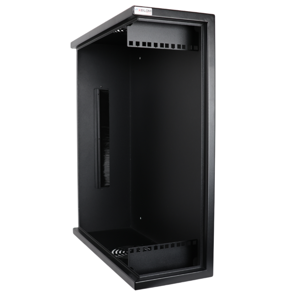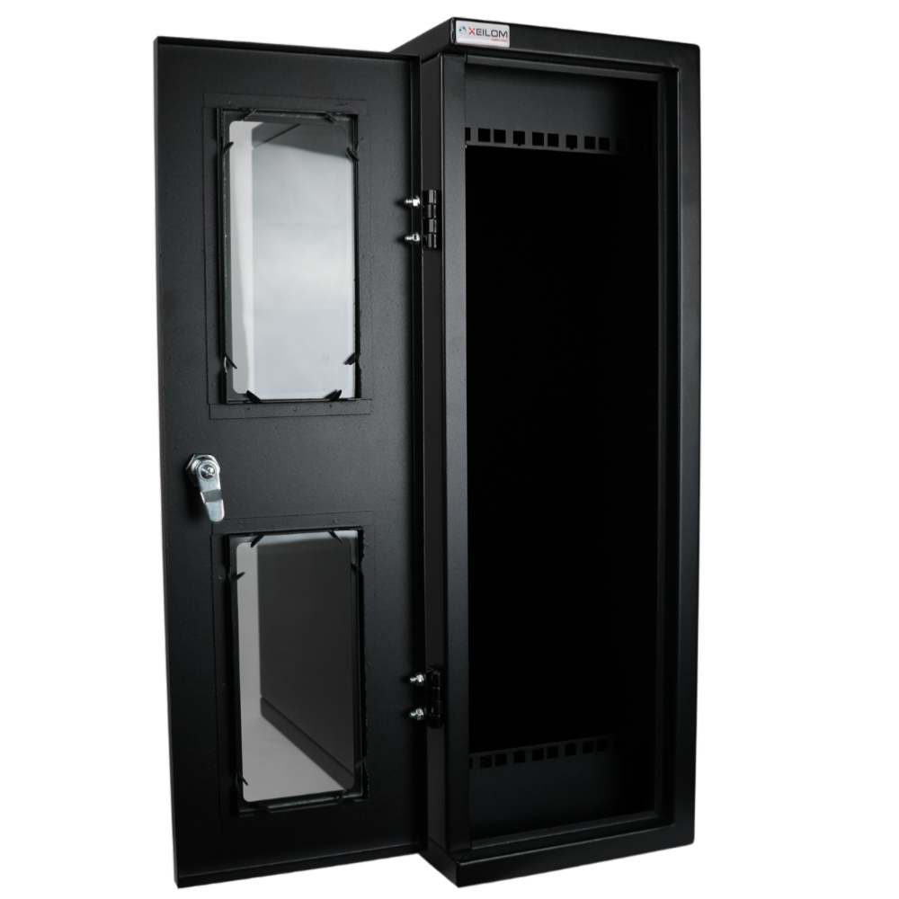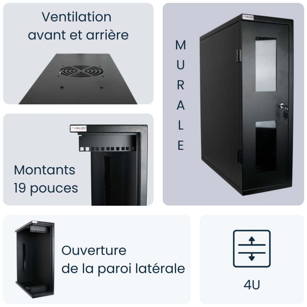 Pour une ventilation active, les grilles d'aération peuvent être remplacées par des ventilateurs, assurant ainsi une circulation d'air optimale pour vos équipements. La porte est rabattable et s'ouvre à un angle de 180 degrés pour un accès facile.
